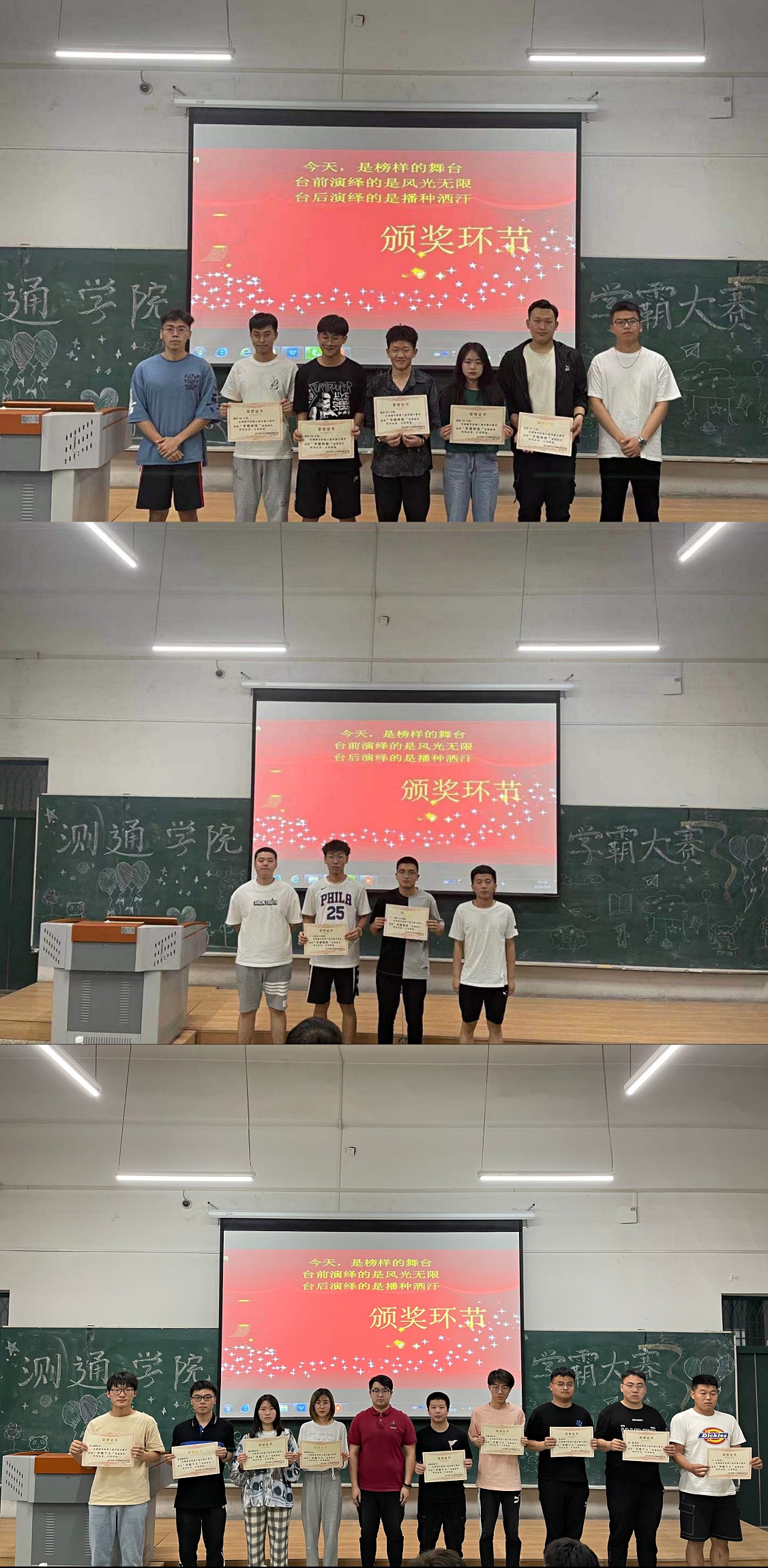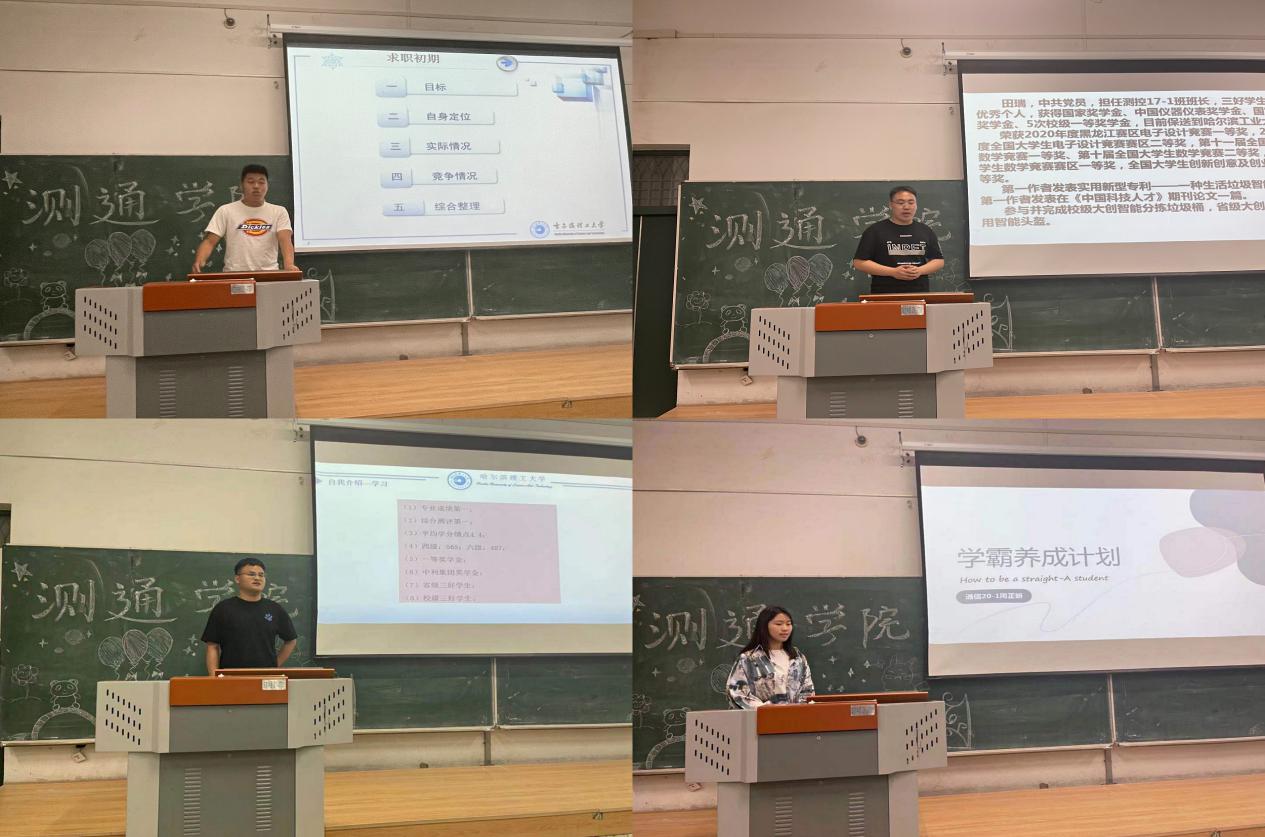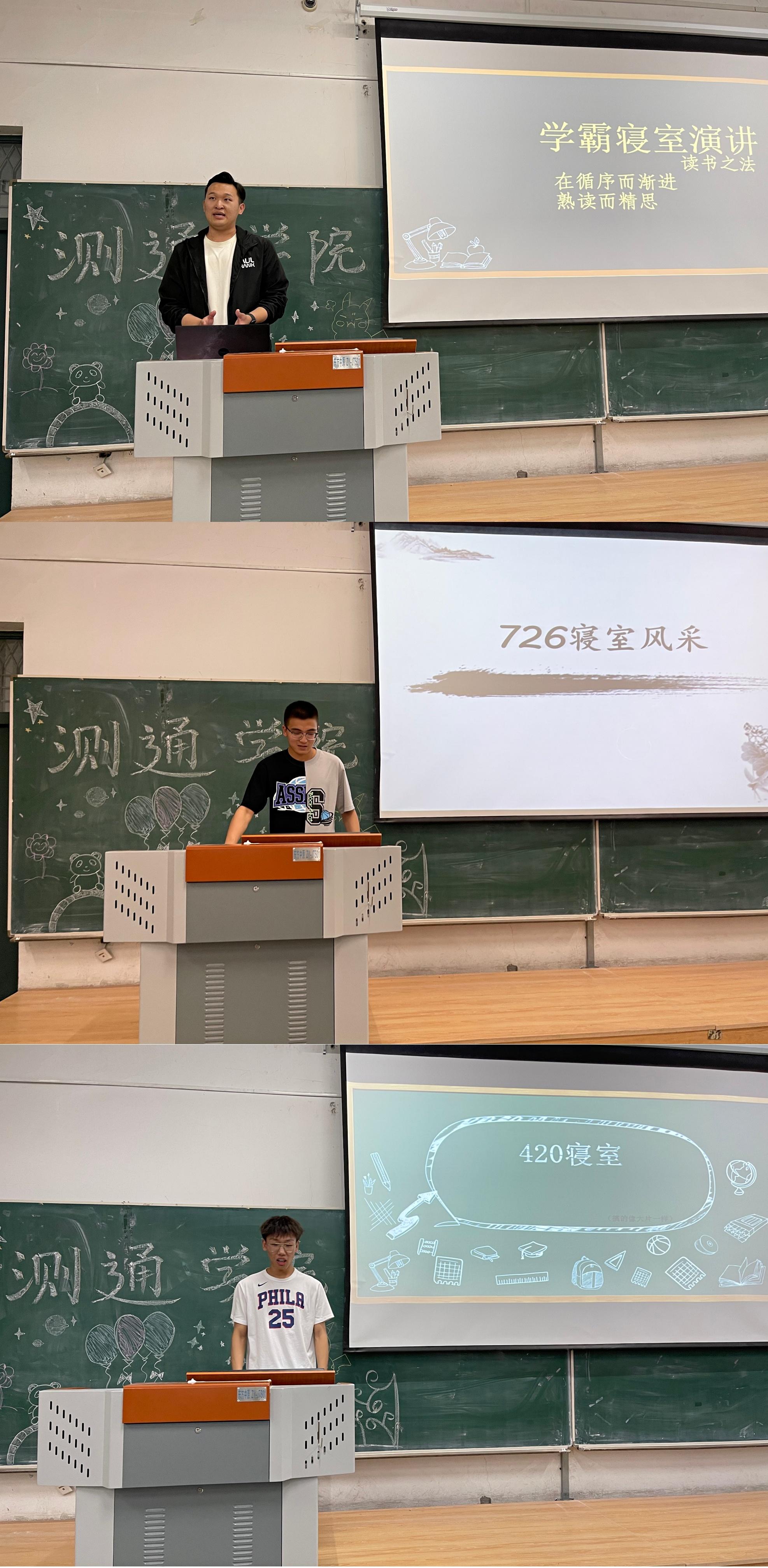 比赛开始前,相征老师借生活中的实例,晓之以理动之以情地为各位同学分享了学习的重要性。他强调,当今社会是学习型社会,只有正确掌握学习方法,做到“向榜样学习”、“终身学习”,才能拿到通往成功的钥匙。本次比赛总共分三个环节,分别为学霸班级,学霸寝室,学霸个人的展示,来自测通学院四个年级、六个专业的同学分别从他们各自的视角为低年级的同学分享他们在学习和生活中的经验和习惯。学霸大赛正如其名字一般,是学霸的比赛,学霸的比拼,学霸的竞争。低年级的同学看到学霸们在台上激烈竞争的同时,也能学习到学霸的经验。大一的同学能学到学长们的学习经验,大二的同学能明确自己的方向,大三的同学能获得实时信息,大四的同学能了解未来的可能。本次决赛的参赛选手有竞赛大神,保研大佬,考研大能,工作大拿;也有曾经学院的团委副书记、学生会主席、班长和寝室长,他们在本次学霸大赛上为学院的学弟学妹们毫无保留的分享。