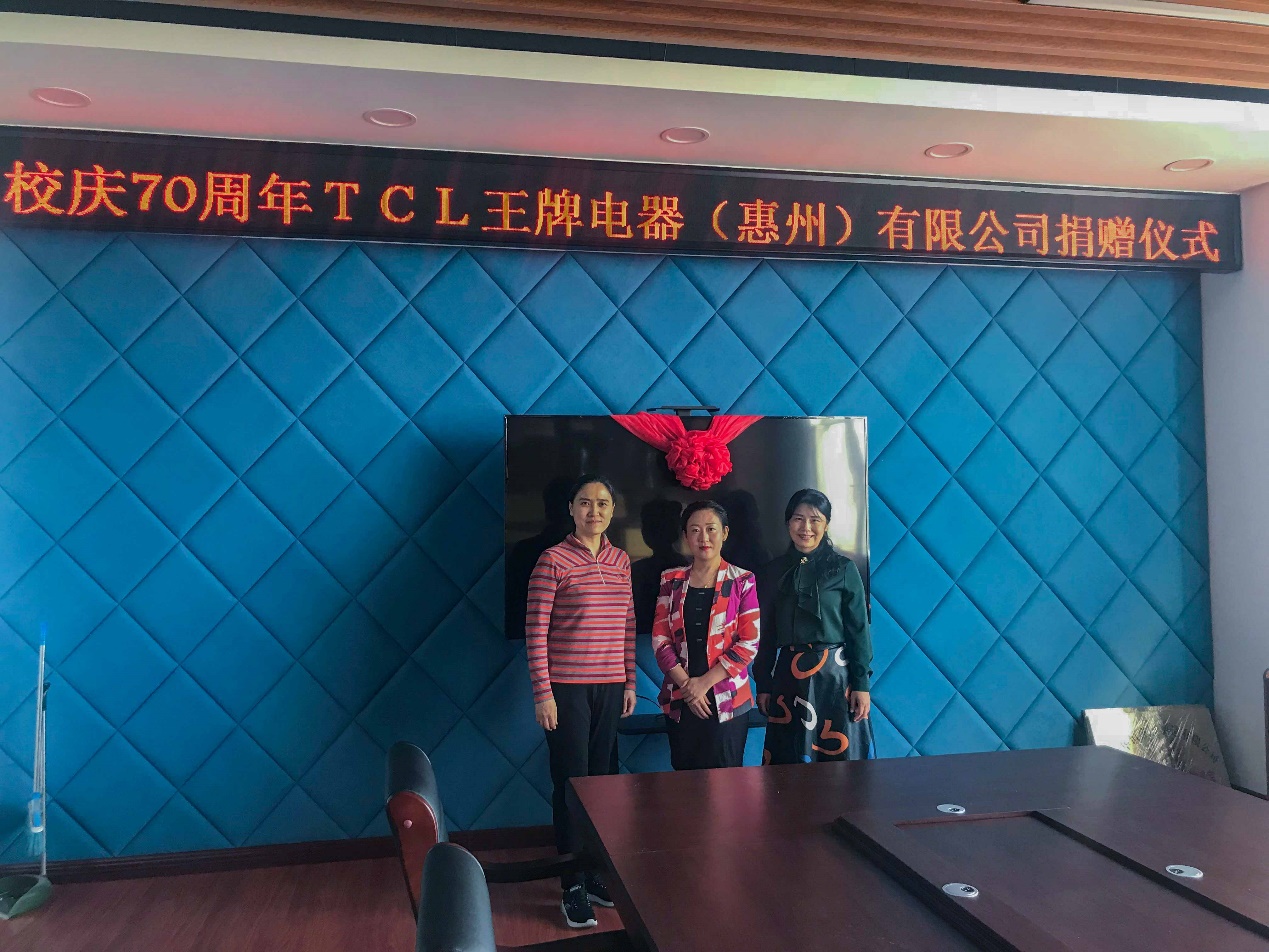 在哈尔滨理工大学喜迎70周年校庆之际,TCL王牌电器(惠州)有限公司向测通学院捐赠两台多功能75寸液晶电视,助力学院会议室硬件建设。9月14日赵立娜经理莅临测通学院参加捐赠仪式和交流活动,学院党委书记顾大兴、副书记田海燕、辅导员邬长明、侯梦雪参加了捐赠仪式。